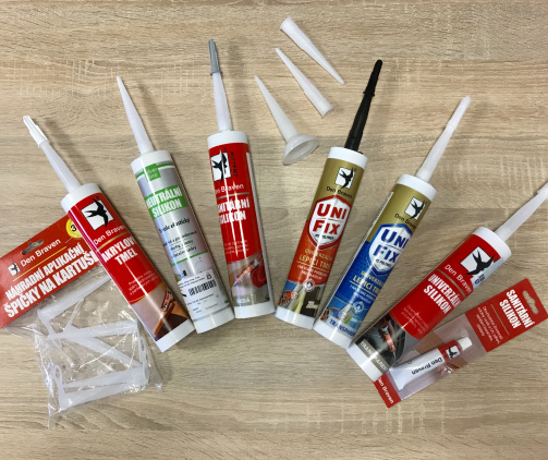 | Tmel střešní, bitumenový, Den Braven | Tmel klempířský, Den Braven | Tmel akrylový Red Line, výrobce Den Braven | Tmel parketový, Den Braven |